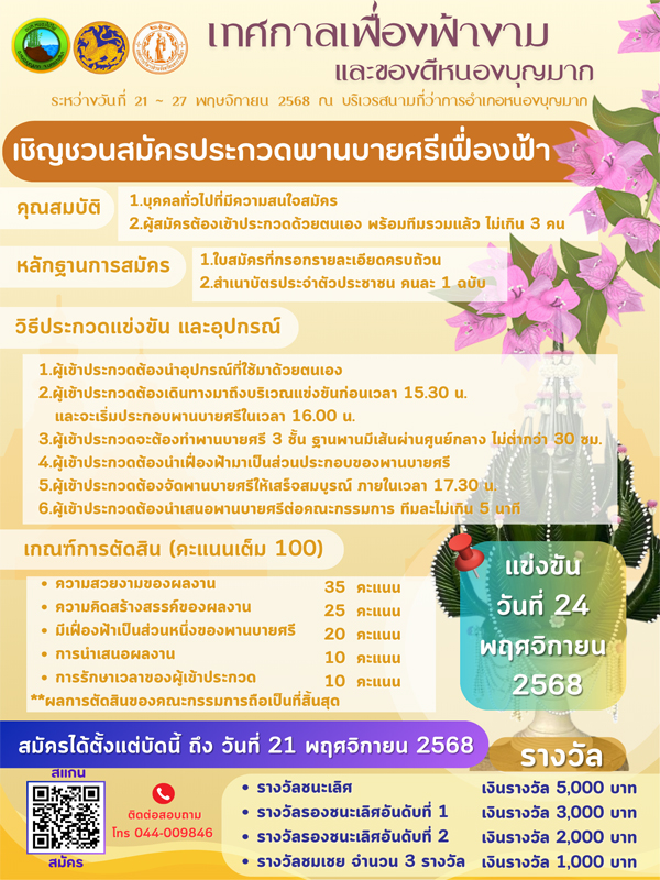 องค์การบริหารส่วนตำบลหนองไม้ไผ่ ขอเชิญชวนชาวอำเภอหนองบุญมากสมัครประกวดพานบายศรีในโครงการเทศกาลเฟื่องฟ้างามฯประจำปีงบประมาณ 2569